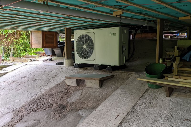 We replaced our windows and doors to more efficient ones. We added extra insulation wherever possible to the loft, voids and under the floor. Insulation fitted under the house is 100mm sheep wool. More recently, a Midea 8kW air source heat pump (ASHP) was fitted. As our home is on top of a slope on stilts, we managed to have the ASHP installed under the house.